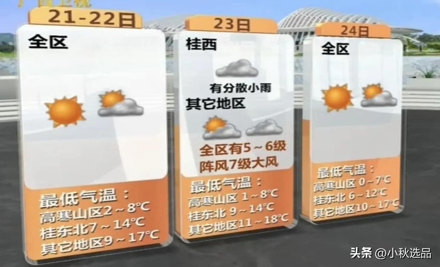 明早啊在高寒山区局地会有霜冻,由于晴空之下缺少云层保温,所以白天升温快,夜里降温也快,明早呢不少地方的气温啊只有个位数,而中下午全区气温集体升到20来度,温差较大,您要适时的增减衣物,21到22号晴间多云的天气没有改变,23号新一股冷空气南下,影响广西各地云量增多,但是降雨依旧不明显,