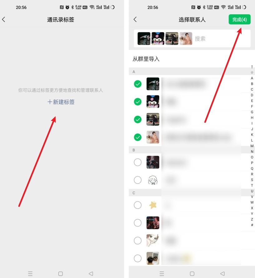2、接着点击【新建标签】,然后选择想要放到一个组的好友,再点击右上角的【完成】;