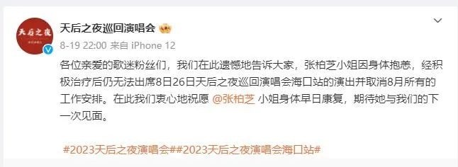 随后,“天后之夜巡回演唱会”官方账号发布公告称:“各位亲爱的歌迷粉丝们,我们在此遗憾地告诉大家,张柏芝小姐因身体抱恙,经积极治疗后仍无法出席8日26日天后之夜巡回演唱会海口站的演出并取消8月所有的工作安排。在此我们衷心地祝愿张柏芝小姐身体早日康复,期待她与我们的下一次见面。”
