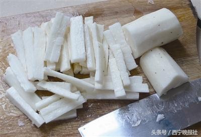 1.山药去皮洗净,切成长段然后再竖切成条用清水浸泡;
