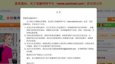 本次公告发布期为30日,自公告发布之日起第31日(即2022年8月12日24:00),易趣网将关闭网站所有商品、商铺的交易功能,关闭易趣网用户注册、登录、充值功能,关闭网站服务器。为保证您的钱款安全,请您尽快登录易趣网,查看您的账户及以过往交易记录;在2022年8月12日24:00前,我们还为您保留网上余额退回功能,请您及时操作,保障您的合法利益。本次公告发布期内,请您拒绝点击易趣网上或以网上商铺名义给您发送的一切商品或支付链接,避免产生不必要的财产损失和纠纷。