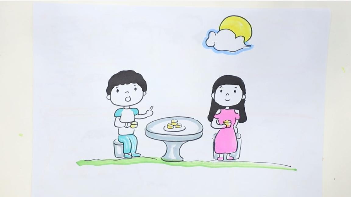 步骤③将衣服涂上喜欢的颜色,月饼涂上黄色,草地涂上绿色,石凳和石桌涂上灰色。