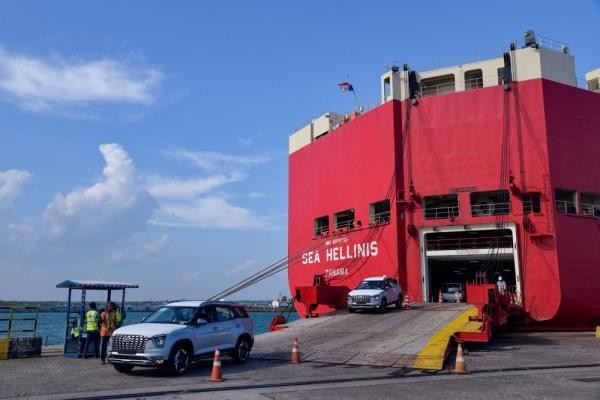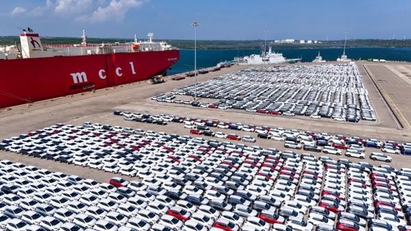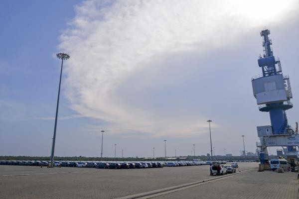 ↑3月28日,在斯里兰卡汉班托塔港,滚装船卸运汽车。