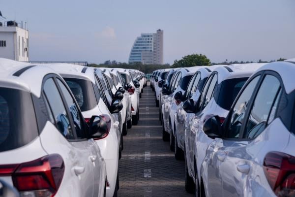 ↑3月28日,卸运的汽车整齐地停放在斯里兰卡汉班托塔港。