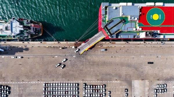 ↑3月28日,在斯里兰卡汉班托塔港,滚装船卸运汽车(无人机照片)。