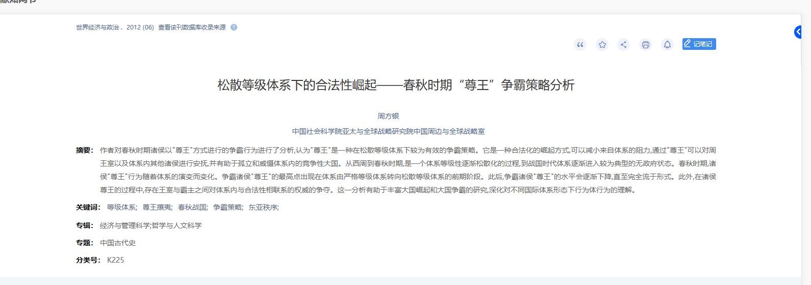 [1]周方银.松散等级体系下的合法性崛起——春秋时期“尊王”争霸策略分析[J].世界经济,2012,(06):4-34+156.