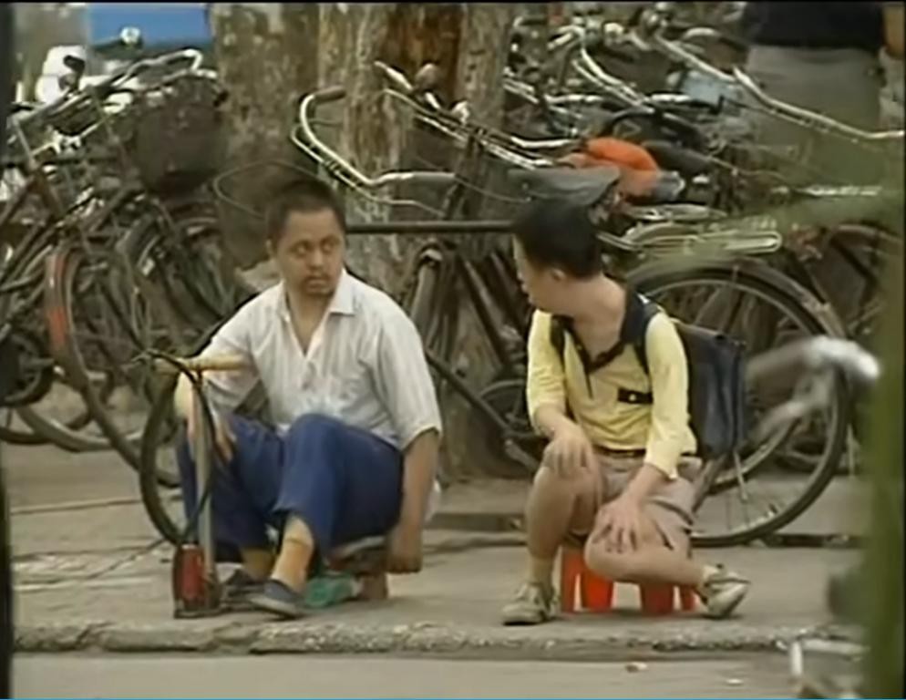纪录片中,舟舟被父亲安排到一条马路边实习,和一位同为唐氏患者的人,在街边给自行车打气,以此来挣点钱,锻炼自己养活自己的能力。