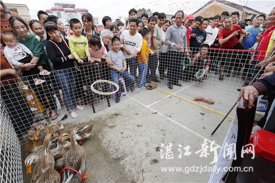 当天下午2时30分,游园活动前一个小时,群众早早聚集到村中文化广场。本次活动以村中广场舞文艺演出队自编、自演的节目拉开序幕;村姑翩翩起舞,把欢乐喜庆尽情演绎;村民魔术表演,妙趣横生,吸引众小孩,也获得村民阵阵掌声。接着有拔河比赛,分党员先锋队VS村民代表队、中年队VS青年队、女子中年队VS女子青年队,各队轮番上阵,精彩纷呈。比赛队员当中的亲人、孩子在身边观看助威,加油声、欢呼声和掌声此起彼伏。乒乓球比赛和台球比赛,这两项活动大多是小学生和青年参与,大家轮番上阵。而最吸引大众参与的是快乐圈鸭子、圈玩具项目,圈鸭子摊位被群众围得里三层外三层的,大家摩拳擦掌,等候一显身手。每家每户派一名代表,每人只有3个圈套鸭,有的可套中两只鸭子,套中的皆大欢喜,没套中的,明年再来。而圈玩具项目,小朋友文明自觉有序地排队参与。下午五时多,当最后一个鸭子、一个玩具被套中,春节游园活动完美结束。
