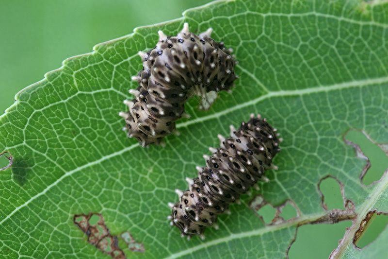 幼虫:灰黄色,体肥厚而扁,头黑褐色,头部常缩在前胸内。体两侧各具列较大的乳白色枝刺,体背具较小刺突;体背面、侧面有成列近圆形黑斑;腹足褐色。