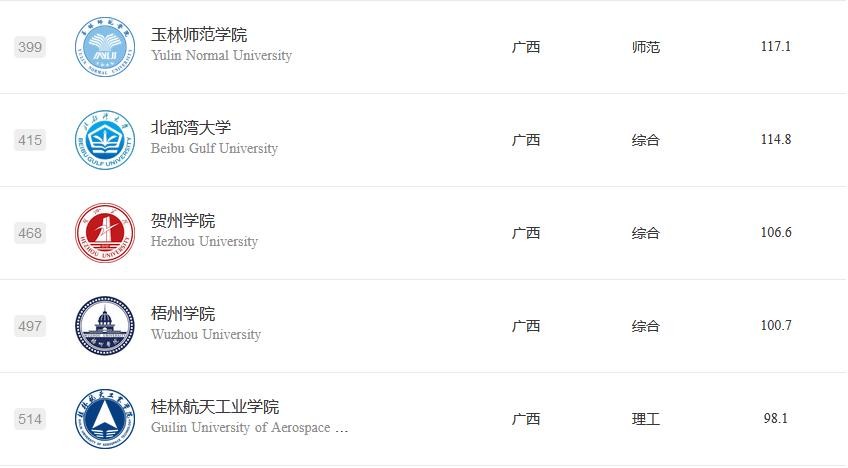 进一步深入,排名第十一至第十五的高校有玉林师范学院、北部湾大学、贺州学院、梧州学院和桂林航天工业学院,它们同样在理工、综合、师范等多个领域展现了广西高等教育的全面性和多样性。