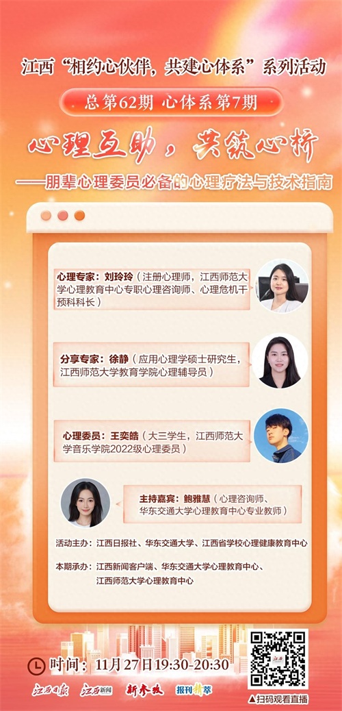 江西新闻客户端讯(夏雨欣 实习生章丽萍)为继续加强校园心理服务体系建设,11月27日晚,江西日报社、华东交通大学、江西省学校心理健康教育中心继续举办全省大型分享谈话类活动——江西“相约心伙伴,共建心体系”公益活动。本次访谈主题为“心理互助,共筑心桥——朋辈心理委员必备的心理疗法与技术指南”。