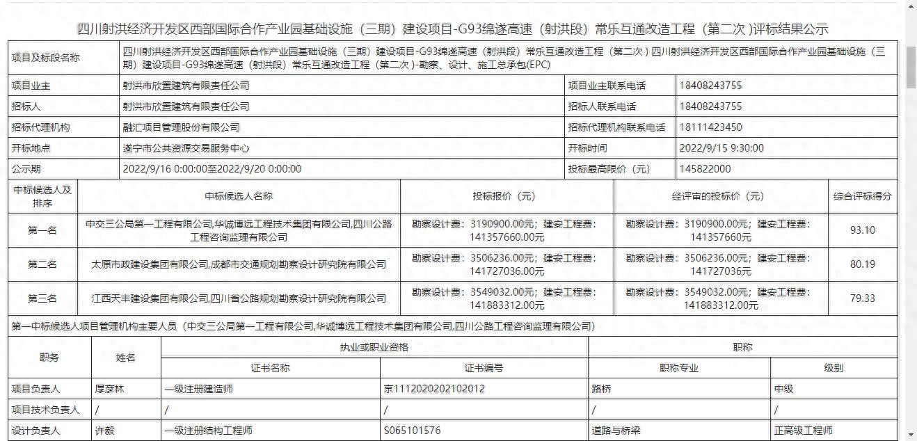 第一名:中交三公局第一工程有限公司,华诚博远工程技术集团有限公司,四川公路工程咨询监理有限公司,报价:勘察设计费:3190900.00元;建安工程费:141357660.00元,评分:93.10分。