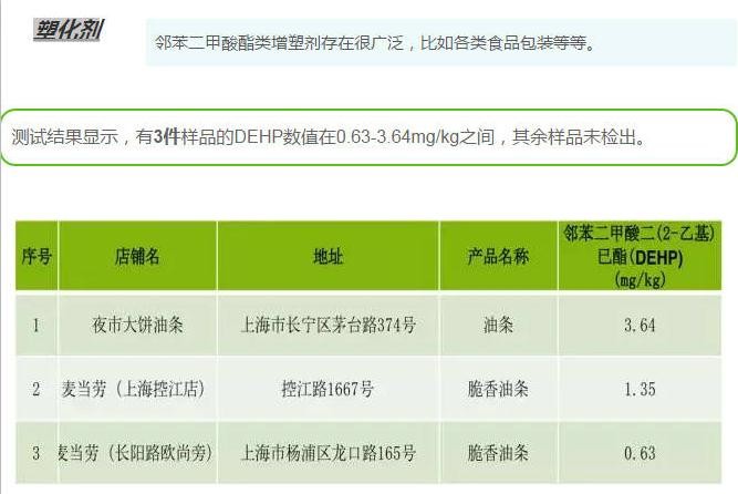 12月4日,上海市消保委发布了上海市29家人气油条店的油条体察报告,其中不乏大牌店、网红店,发现问题多多。结果显示,一家上海麦当劳门店的油条被检出塑化剂(DEHP)数值为1.35mg/kg,接近于国家临时限量值的上限水平。