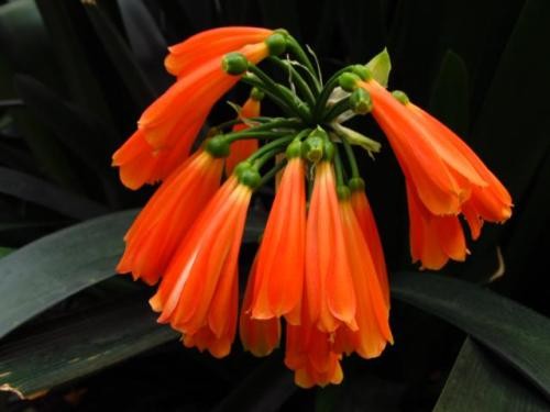 垂笑君子兰高雅肃穆,叶片狭长,花茎稍短叶于叶,花橙黄色,开放时下垂,呈桶状,是春节期间布置会场,点缀宾馆、美化家庭环境的盆栽花卉。