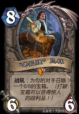 2.“老狐狸”马林。老狐狸是暴雪爸爸送给每一位炉石玩家的礼物,当年这张卡给玩家带来了非常多的乐趣。当玩家打破马林给对面的大师宝箱后,就会随机获得4张衍生牌其中的一张,玩家得到黄金狗头人后可以让自己的手牌都变成传说随从,得到托林的酒杯就可以获得若干张相同的卡牌,奇迹之杖则是抽三张牌费用变为零,还有扎罗格的王冠可以召唤出两只同样的传说随从。