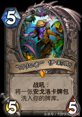 3.“开拓者”伊莉斯。它和伊莉斯·逐星虽然是同一个人,但开拓者伊莉斯是在安戈洛版本才出现的中立橙卡,它的战吼是把一张安戈洛卡牌包塞入玩家的牌库,当玩家抽到卡牌包时,就可以在游戏中进行开包,一包一般至少都会出一张橙卡,但开出来的卡牌只能够在这局游戏中使用。