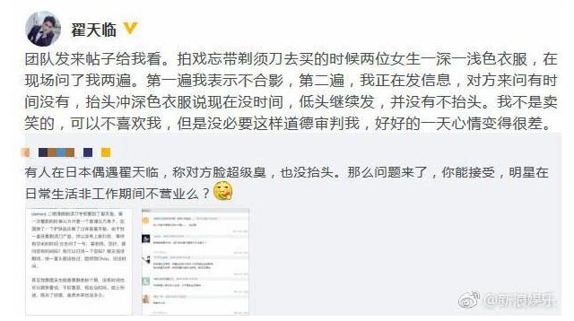今天有网友说在日本偶遇翟天临,跟他要合影时他特别臭脸地说没时间。翟天临自己转发回应说是自己没有臭脸,他没有卖笑的义务,希望大家不要对他道德审判。