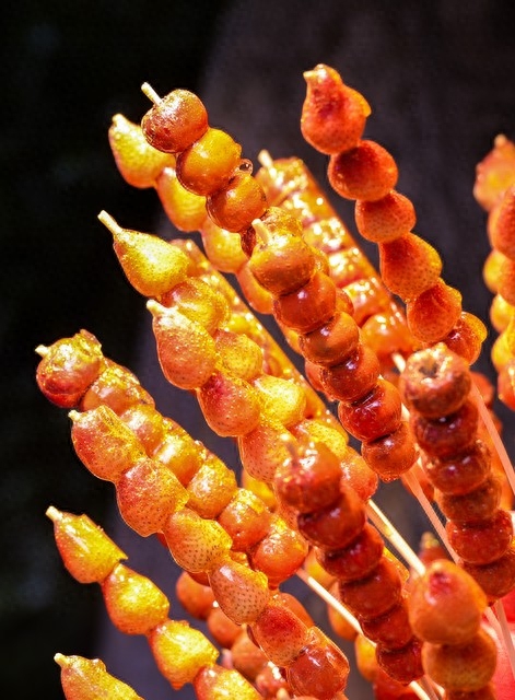 8. 楂糖葫芦:楂糖葫芦是河北地区的传统美食,以串上果脯、山楂、草莓等果实,涂上糖浆而制成,口感酸甜可口。