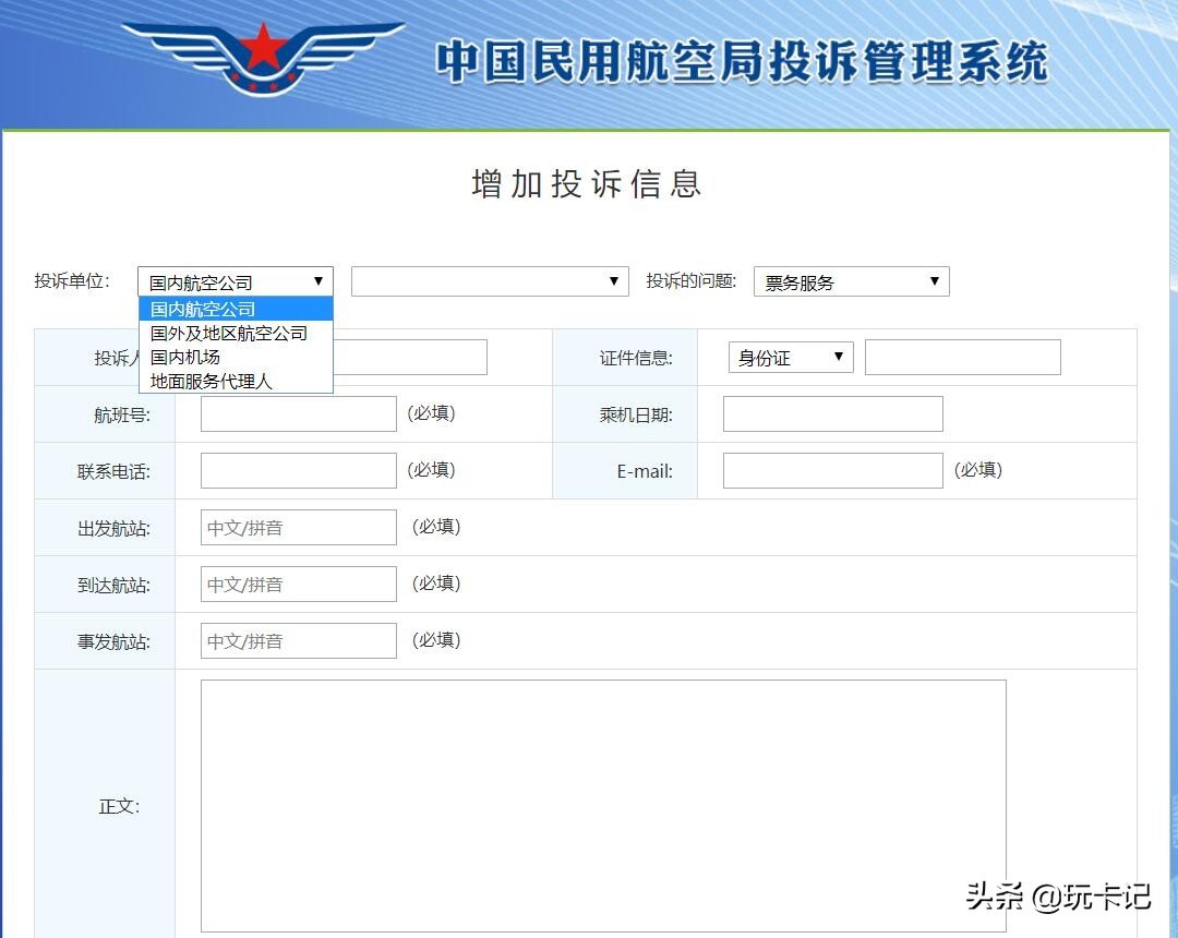 进入后,就要填写详细信息,首先选择自己的投诉对象,是国内航空公司还是国外及地区航空公司,是国内机场还是地面服务代理人。