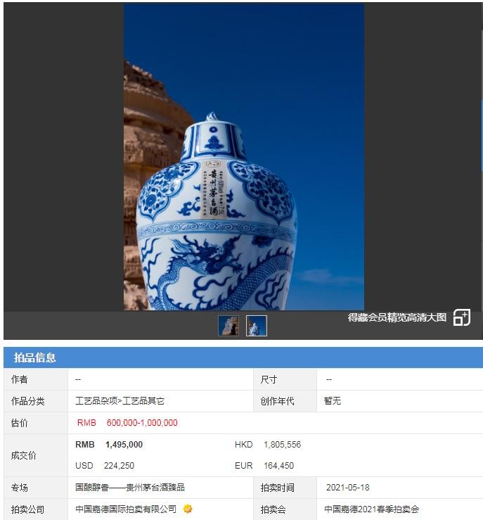 今年5月的时候也拍过一瓶,当时就拍出了149.5万元的高价。春拍才过去半年时间,今年秋拍同样的酒居然拍了189.7万元。
