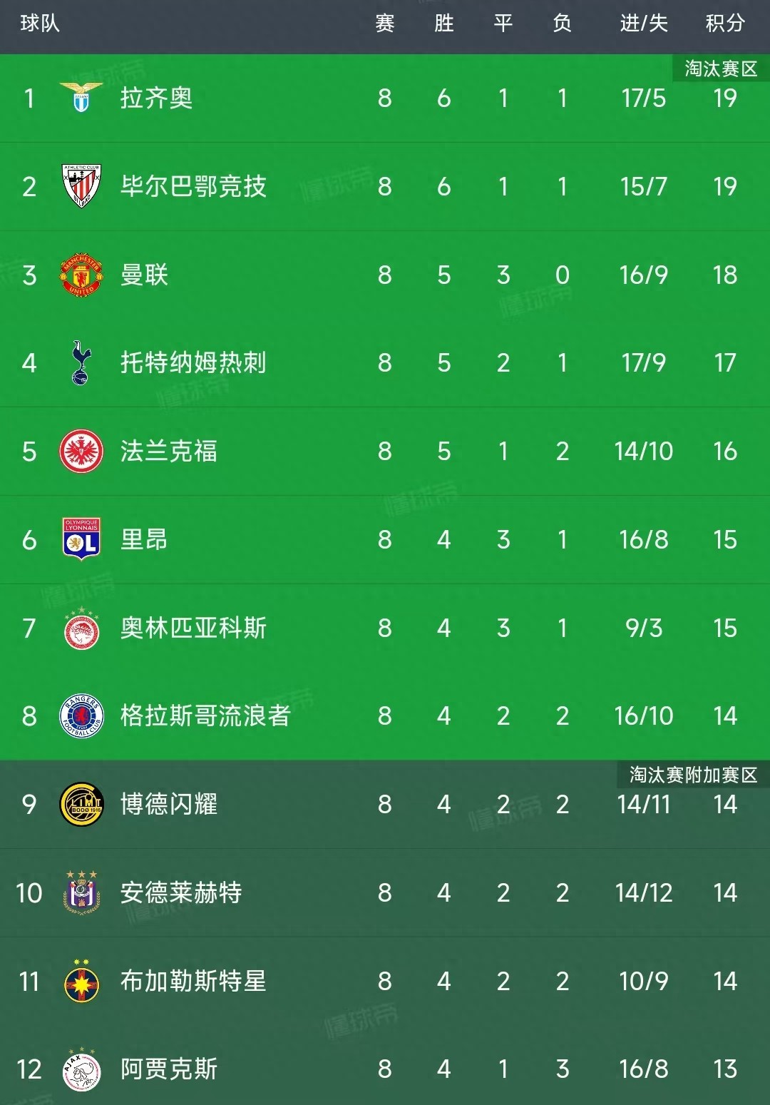 欧联杯结束了8轮比赛,最新积分榜如下!蓝鹰榜首,红魔不败出线