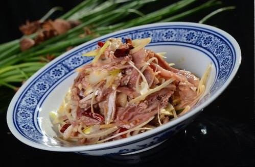 羊肉同上面一样煮熟切片,适量葱段泡入盐水约10分钟捞出。放入盆中加味精,辣椒油,醋,香油拌匀即可。