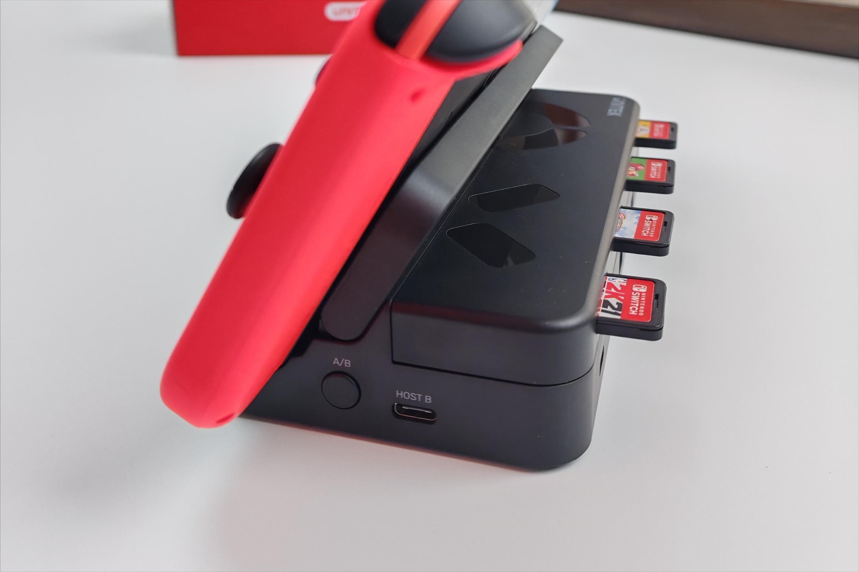 这里给大家补充一点,跟switch原装底座不一样的是,优越者G1002G特别集成了双上行设计的HOST接口,具备KVM功能,搭配双C全功能数据线,就能让switch与笔记本、手机或者平板(*需要是全功能Type-C接口的哦)轻松共享一个屏幕!