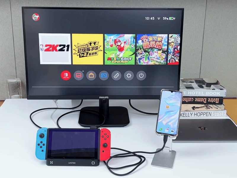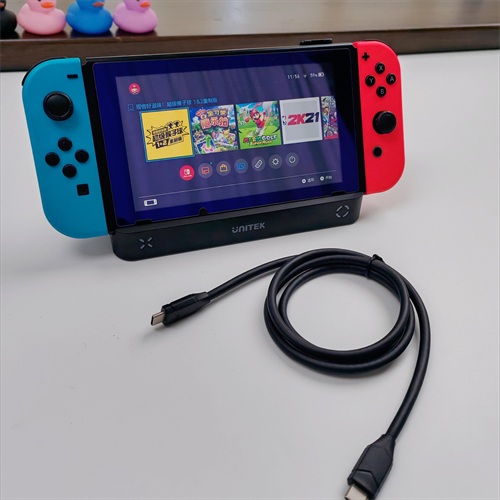 1、连接 Switch:使用HDMI线连接G1002G底座与显示器,并接通电源;然后将Switch主机放入底座;