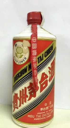 特征:乳白色的玻璃瓶,深红色内置封膜,外旋红色塑制螺旋盖。此瓶酒属于变异品种,内盖竟然有封膜,然后盖上螺旋盖,外面再次封膜。“葵花”商标,最早出现在1967年下半年,当时“茅台酒厂革委会”,宣布启用“葵花”商标替代外销”飞天“,商标用于出口,该标葵花居中,外文:“sunflower”,寓有“朵朵葵花向太阳”之意,1973年“葵花”商标被当时该商标拥有方——中国粮油进出口总公司宣传暂停使用。1975年改为“飞天”商标。