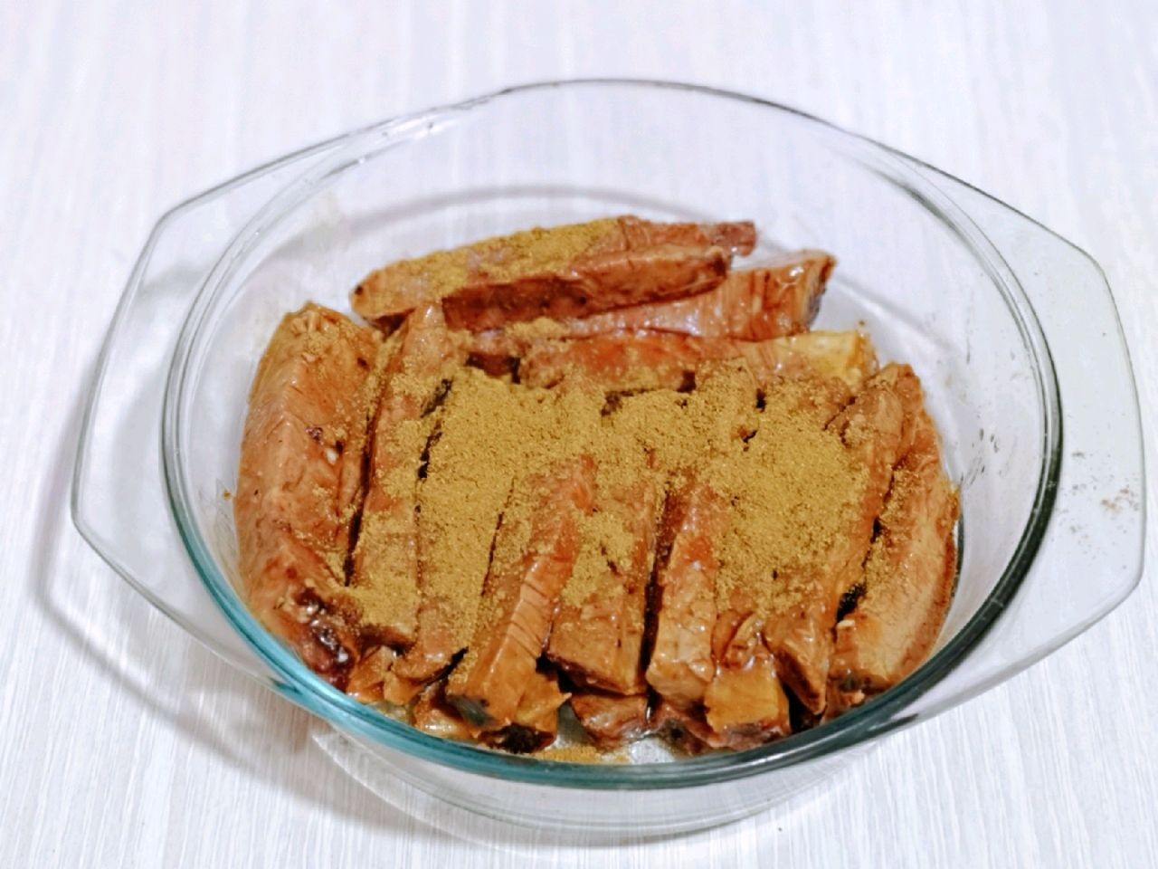 7、撒入一些五香粉和孜然粉,尽量是撒的均匀一点,要是不喜欢孜然粉的话也可以不加。