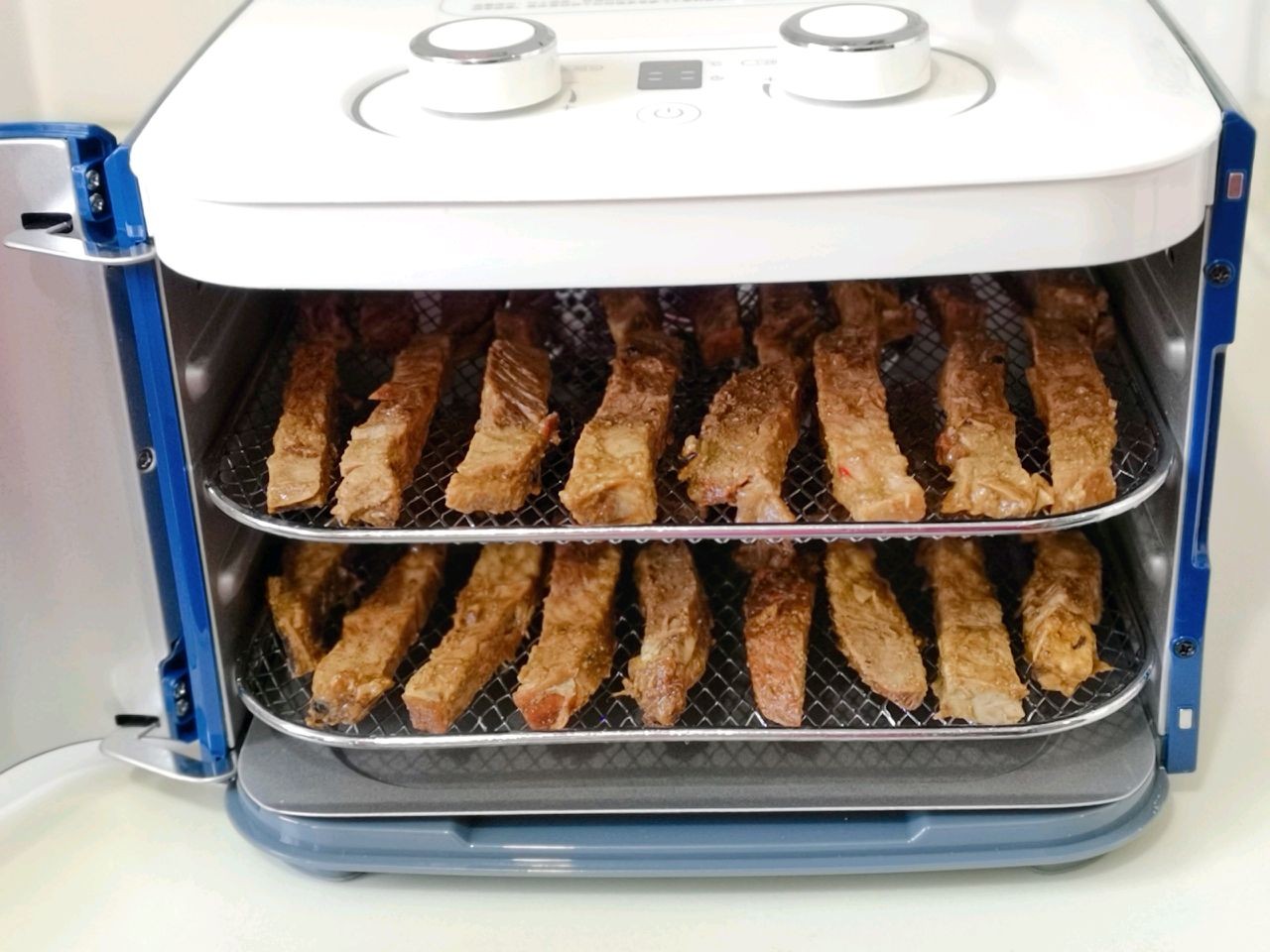 10、接下来就是设置合适的温度和时间,当然也要看口感,喜欢更有嚼劲的牛肉干,那时间就会久一点,风干好的牛肉干放凉就可以吃了。
