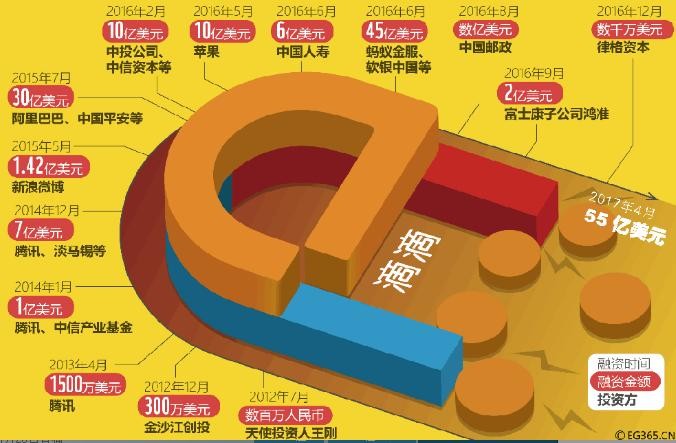 滴滴出行完成了新一轮超过55亿美元的融资,以支持其全球化战略的推进和前沿技术领域的投资。投资方包括,软银、银湖资本、招商银行和交通银行,而本轮融资完成后,滴滴的估值可能会增加到500亿美元左右。