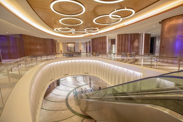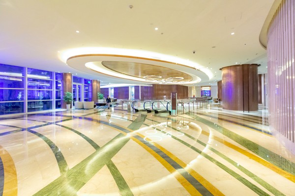 酒店的门头设计同样引人注目,大量的曲线设计使得酒店看上去更加柔和,大大减少了视觉冲击力,即便是这样的庞然大物,也能带给人小家碧玉之美。