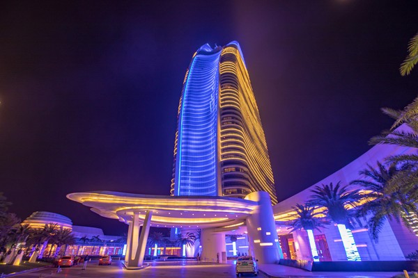尤其是当夜幕降临时,酒店宛若一位楚楚动人的姑娘,静静伫立在海棠湾,不言不语,独自散发着芬芳。初见酒店,我就被其独树一帜的外观设计所吸引,准确的说,来到亚特兰蒂斯的一瞬间,这座美得不可一世的建筑就捕捉了我的全部视线。酒店的主体建筑采用波浪型,宛若两座随风飘扬的船帆,在灯光的映衬下,热情时尚,有种可远观而不可亵玩之美。