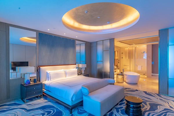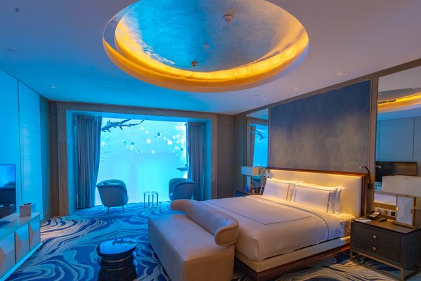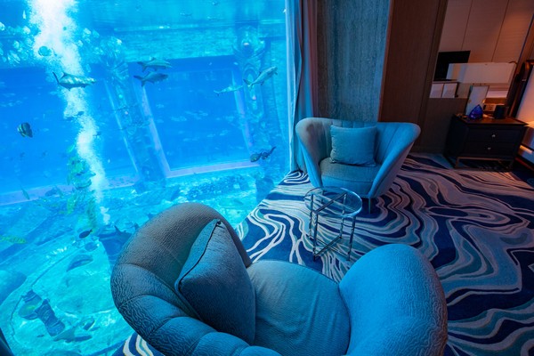 由于时间关系,我们并没有入住体验,只是参观了一下海景套房。打开房门的那一刹那,我仿佛重新穿越回水族馆,那些不曾遗失的美好再一次浮现脑海,房间采用大量的海洋元素,在蓝绿色灯光的设计下,让人宛若置身幻境,有种不可言喻之美。