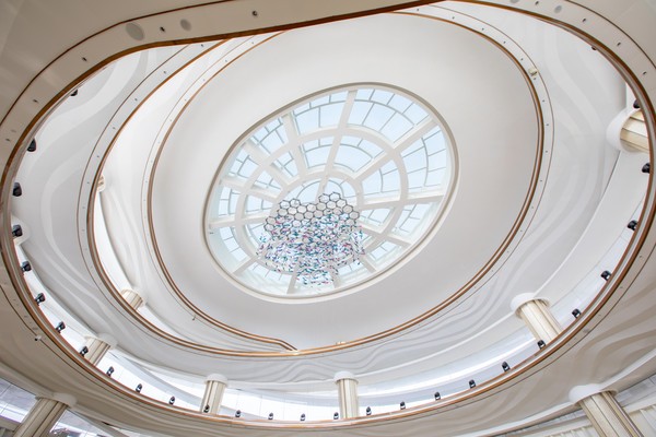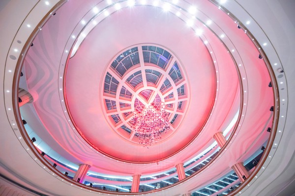 酒店融入了大量曲线设计,无论是吊灯,楼梯还是地砖,都传递出浓浓的艺术气息,与其说这是一家酒店,倒不如说一座艺术博物馆,精彩纷呈,美轮美奂。头顶的设计足以让人心醉,盘旋之中,一座精美的花瓣吊灯映入眼帘,将墙面照得粉红,宛若抹上了一层胭脂,让人沉沦。
