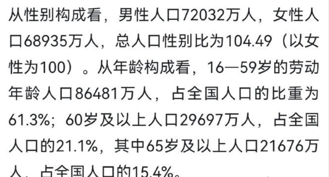 从性别结构上看,男女比例还是失衡。男性人口72032万人,女性人口68935万人,男女比为100:104.49,看来男性找对象越来越难了,有些男性注定一辈子光棍。