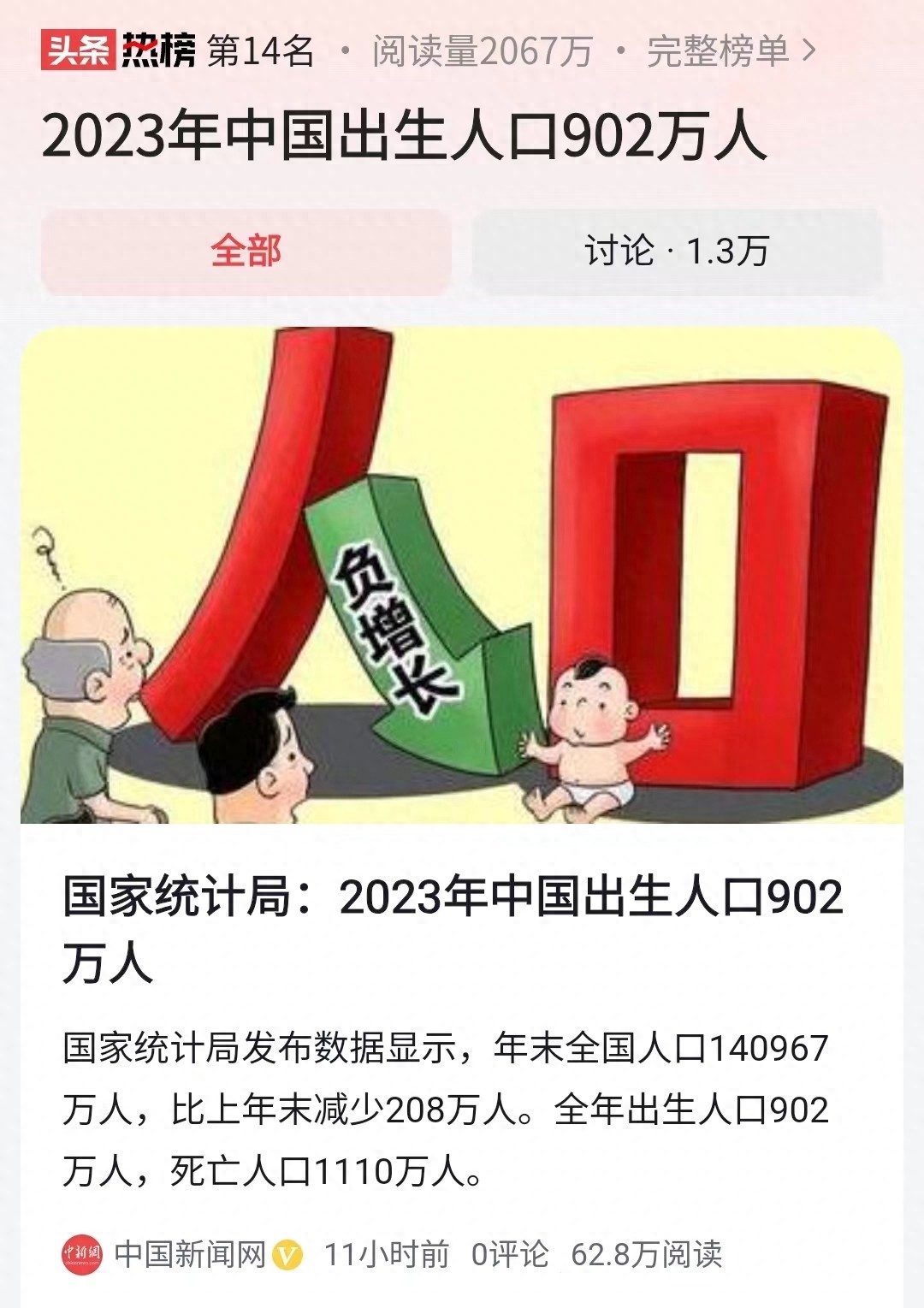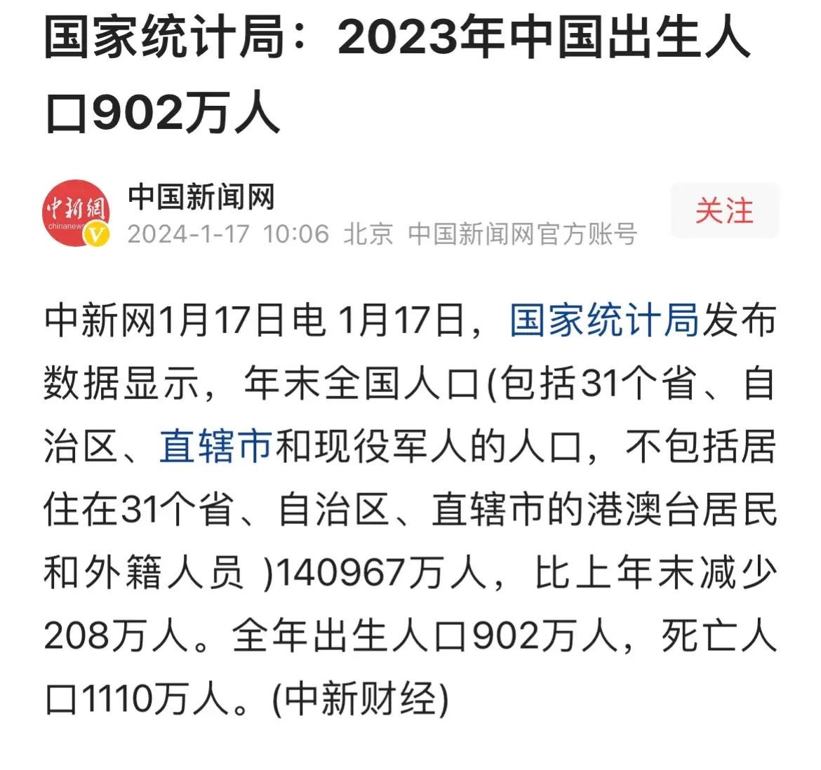 2023年我国出生人口902万人,死亡人口1110万人。这数据一出来,成了头条热榜!