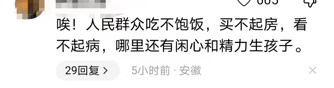 有网友说:现在大家生活太难了,连吃饭都是问题,买不起房,看不起病,哪里有闲心和精力生孩子呢?