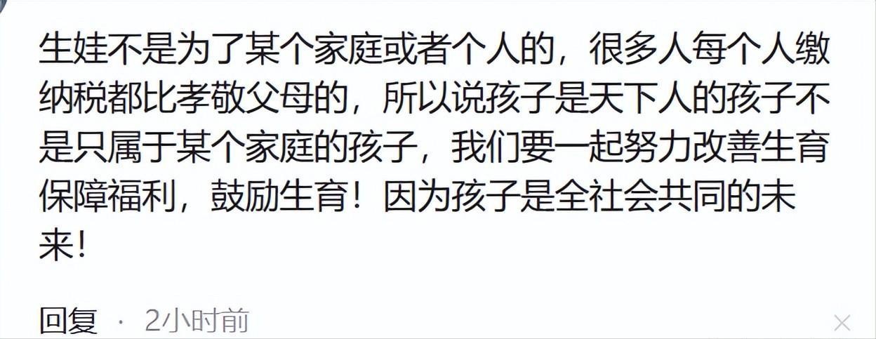 但也有网友不认同:生娃不是个人的事,是社会的事,我们要改善生育福利,鼓励生育。孩子是社会的未来!
