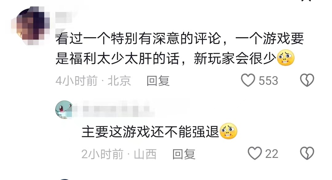 有网友很形象评论这新生入下降数据:一个游戏要是福利太少太肝的话,新玩家会很少。