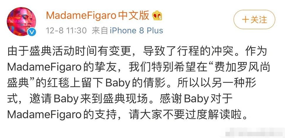 8日中午,主办方主动站出来维护baby,声称盛典活动时间有更改,才导致双方行程有冲突。尽管如此,还是希望在活动盛典上留下baby的倩影,所以以另一种形式,邀请杨颖来到盛典现场,最后希望大家不要过度解读。