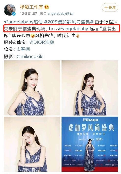 杨颖工作室官微也给出原因,由于行程冲突未能亲临盛典现场,boss angelabaay远程"盛装出席"聊表心意。