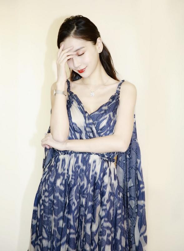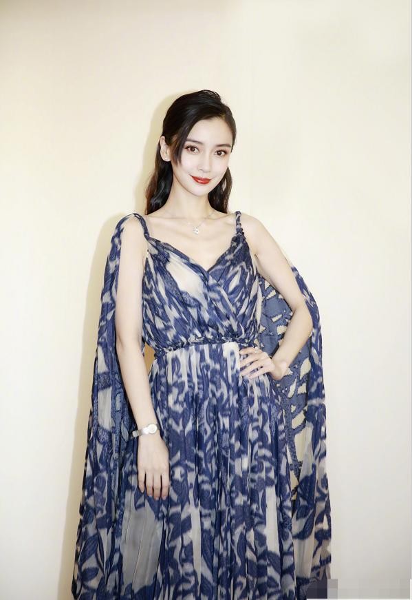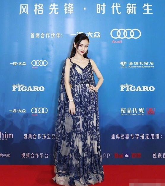 白得发亮的baby,一身蓝色刺绣薄纱连衣裙,妆发精致,眼睛深邃明亮,一手掐腰,一手自然下垂放在身前,"出现"在某时尚活动的现场。