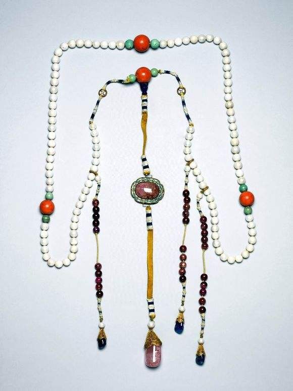 乾隆28年他主持编著的大清会典中,正式把108颗朝珠的制式纳入其中。这才有了我们的现在的顶珠,腰珠,背云等等的搭配形式。