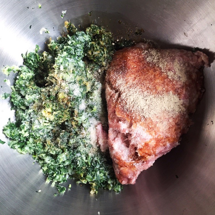 8、在青菜中加入:猪肉,盐,酱油,酱油,糖和白胡椒粉,把它混合起来