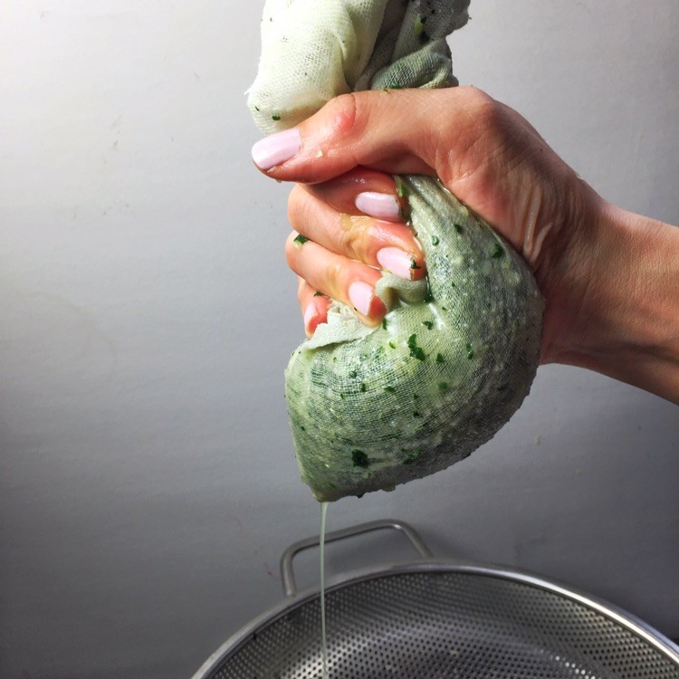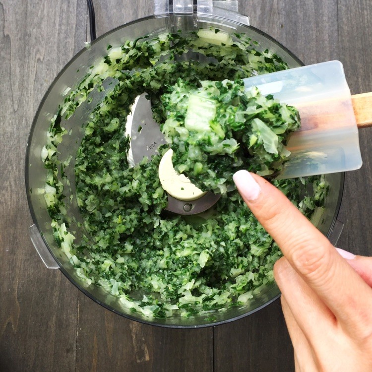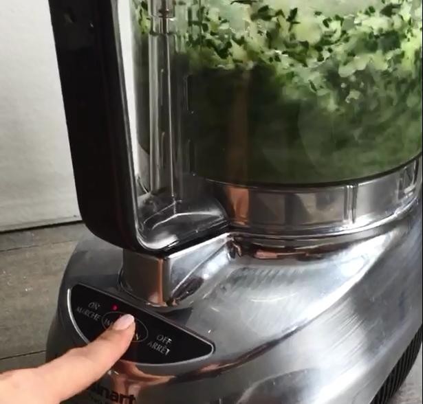 4、青菜沥干水分后将其放入料理机,或者用刀手工剁碎也可以