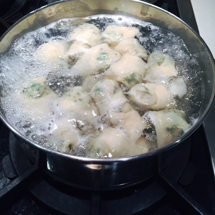 12、用大锅将水煮沸,像吃意大利面食一样加盐调味。煮沸,直到它们全部浮到顶部,如图所示,大约1-2分钟。倒一杯冷水,等它再次沸腾,大约45秒。
