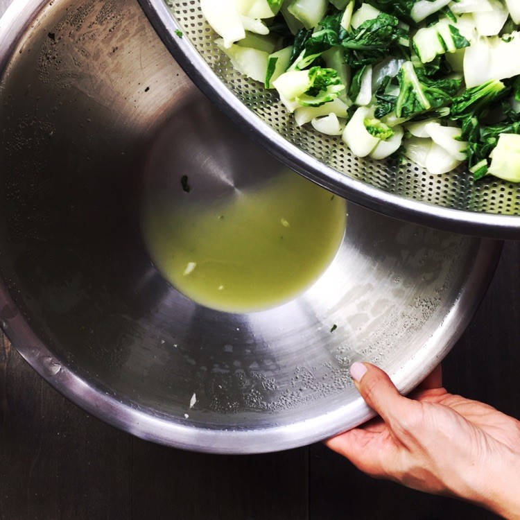 3、用大漏勺将青菜中的水沥干