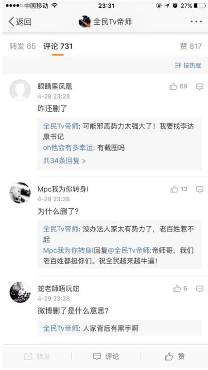 第一次转发随后就删除,但是在评论里回复网友:黑暗势力太强大了,人家背后有黑手,惹不起。